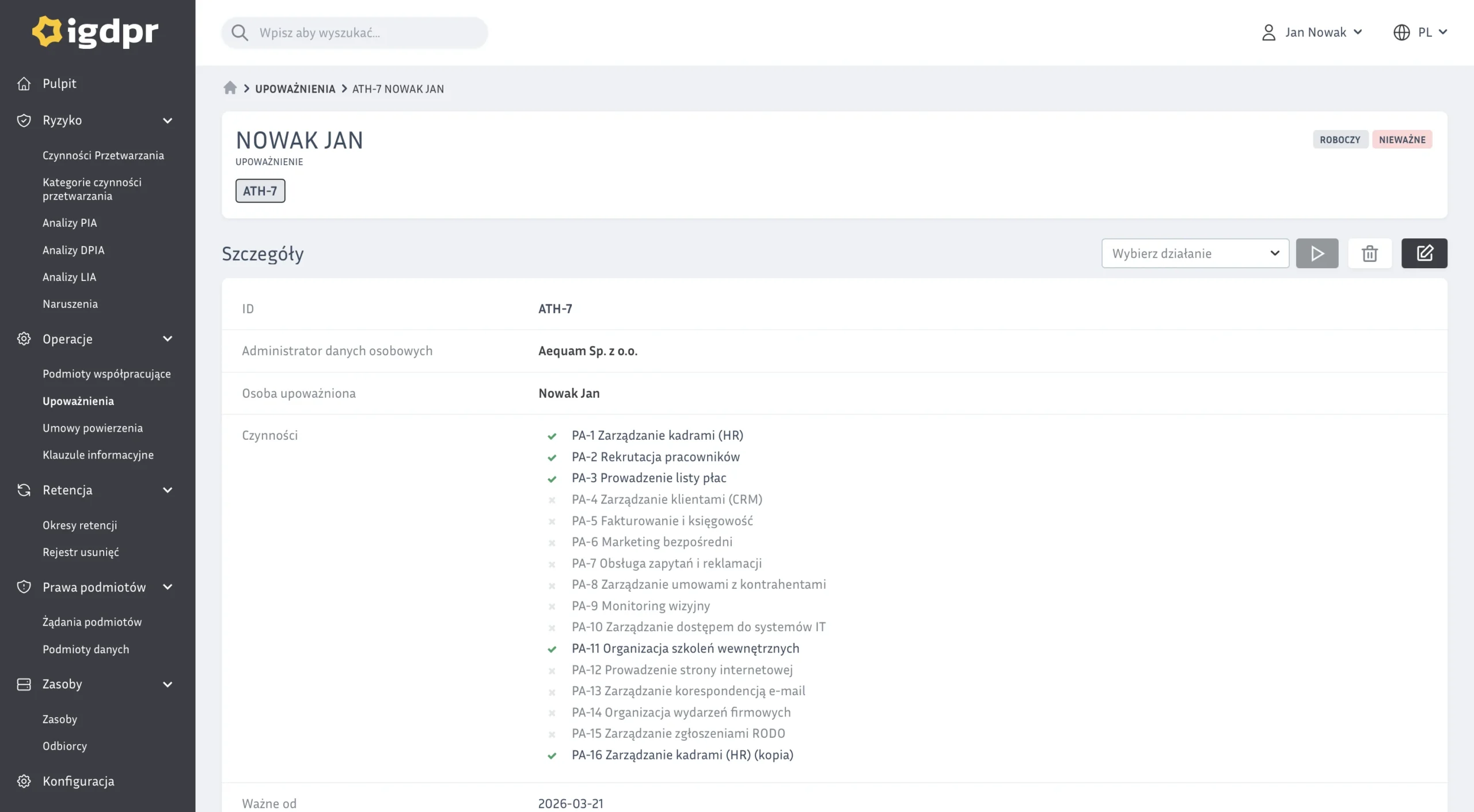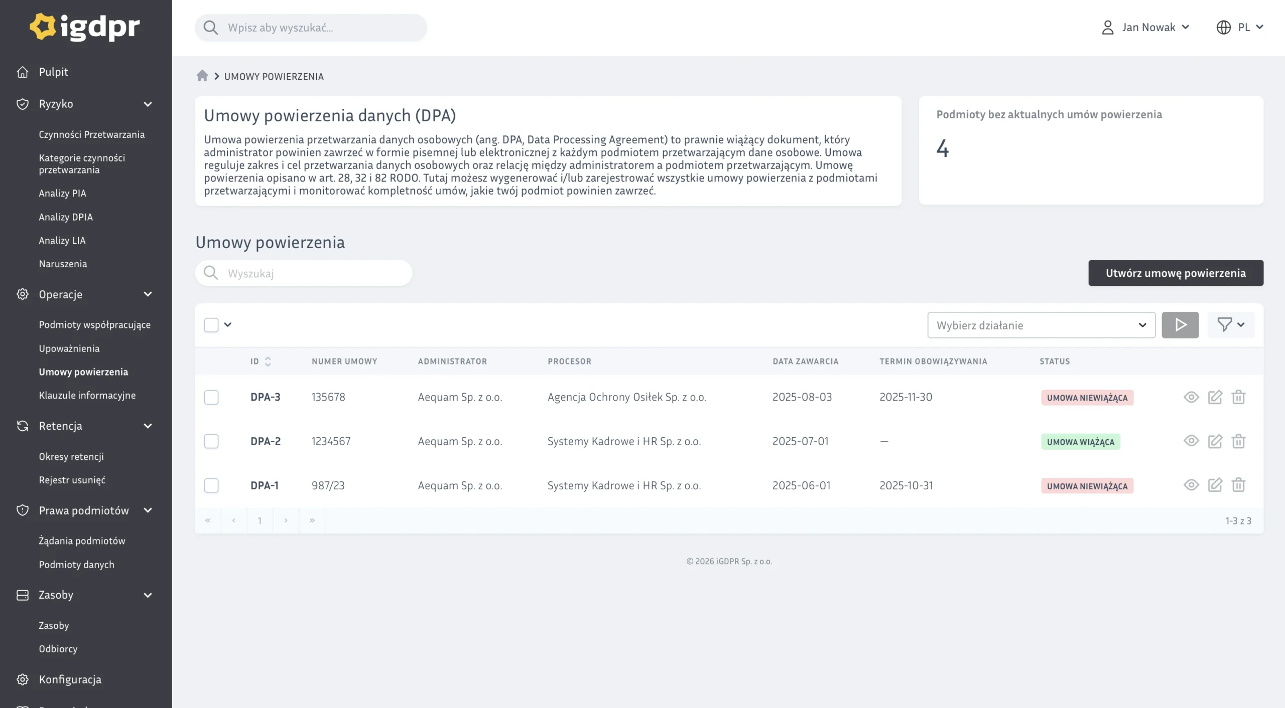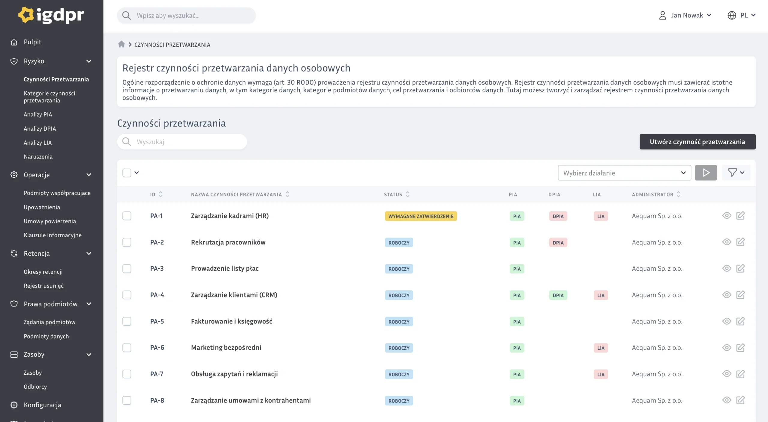 Poniżej najważniejsze obszary pracy w iGDPR. Pełny opis modułów znajdziesz na stronie „Funkcjonalności systemu RODO”.