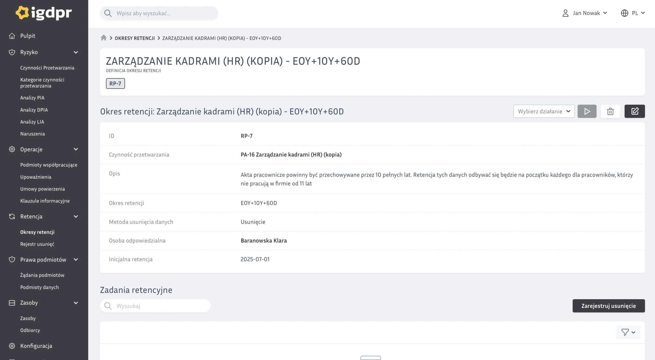 - retencją i rejestrem usunięć
